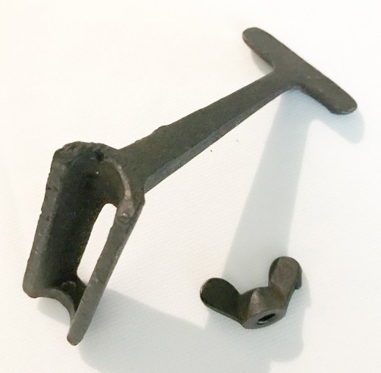 After a light polishing, this firebar trivet is ready to display. My favorite polish continues to be Glorifying Antique Furniture Polish. It’s a citrus and beeswax polish designed for wood, but it’s also great for polishing and protecting decorative cast iron. Directions: lightly apply the polish to a clean, dry trivet; let it sit for about 5 minutes, then wipe off and buff to a beautiful shine. Here are my photos, taken after polishing. I removed the washers and hex nut and substituted a proper antique cast iron wing nut.