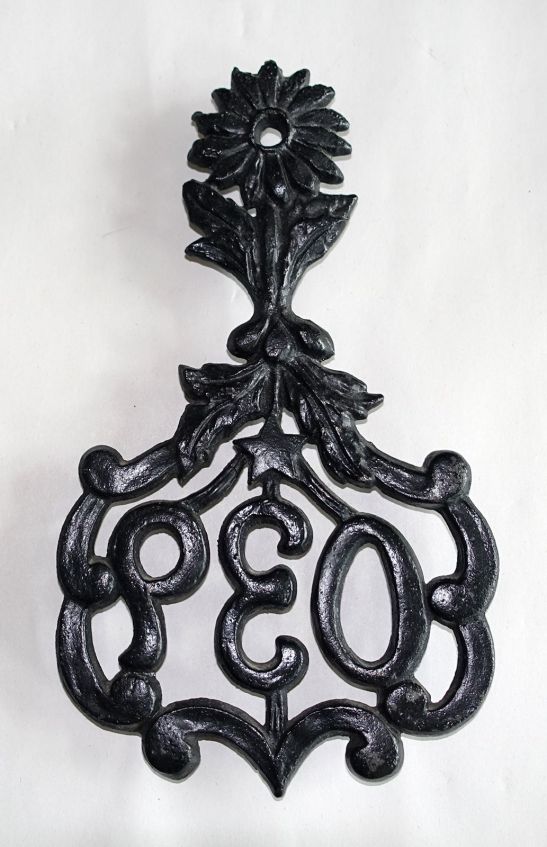 This cast iron trivet measures 9 1/2″ x 5 1/2″ with 3 feet. On the face are the letters PEO. The handle is a Marguerite daisy, the P.E.O.’s official flower. The star above the lettering is the organization’s emblem. The reverse is flat (without backcoping) and unsigned.
