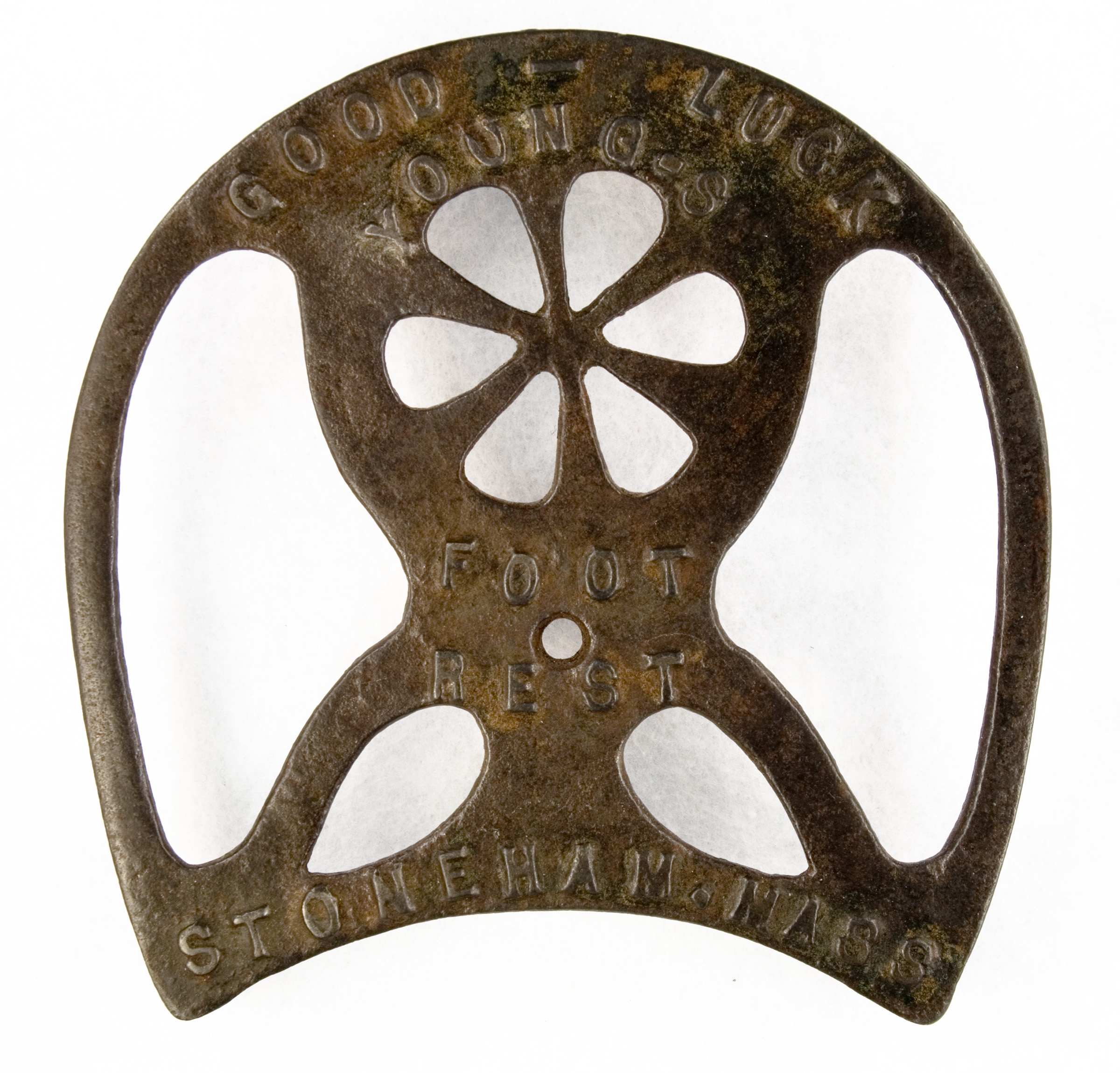 Young’s Stand Version #1 ~ CI, 5 1/2 x 5 1/2” w/two 3/4” feet and one 7/8” cleat. On face: GOOD-LUCK _ YOUNG-S FOOT REST _ STONEHAM. MASS. On reverse: PAT APPL’D FOR. Hole in center; cast through the rim.