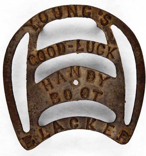 Young’s Stand Version #2 ~ CI, 6 x 5 3/4” w/four legs. On face: YOUNG’S GOOD-LUCK HANDY BOOT BLACKER. Hole in center; unsigned on reverse.