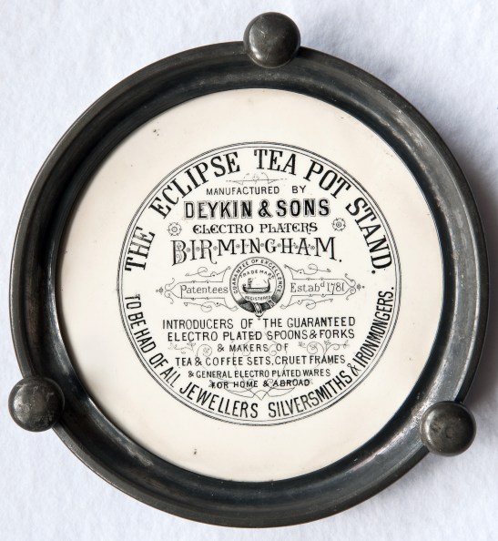 On reverse: company advertising. THE ECLIPSE TEA POT STAND. Manufactured By DEYKIN & SONS ELECTROPLATERS BIRMINGHAM. Patentees Estab’d 1781. Introducers of the Guaranteed Electroplated Spoons & Forks & Makers Of Tea, Coffee Sets, Cruet Frames & General Electroplated Wares for Home & Abroad. TO BE HAD OF ALL JEWELLERS SILVERSMITHS & IRONMONGERS.
