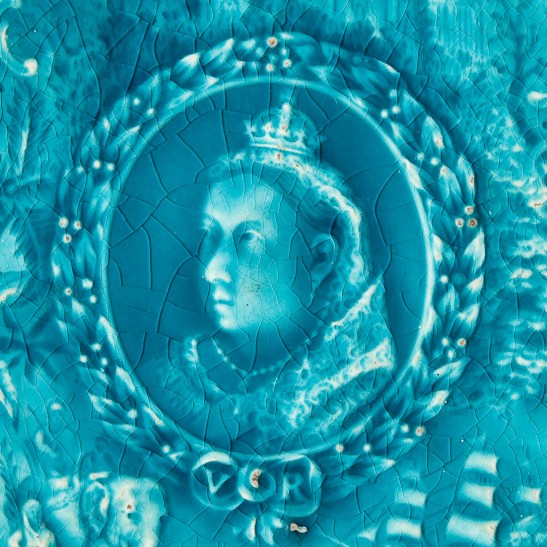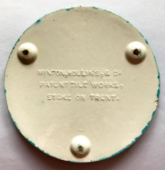 Glazed ceramic, 7” in diameter with three rounded foot supports. On face: Victoria’s portrait, the letters VR at the bottom of the wreath and COMMEMORATION OF RECORD REIGN 1837 to 1897. On reverse: MINTON, HOLLINS, & CO PATENT TILE WORKS, STOKE ON TRENT. Although her image is smaller, Queen Victoria is wearing the diamond necklace, earrings and tiny crown.