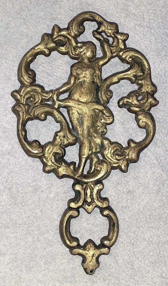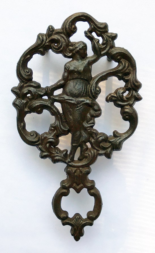 This lovely cast iron trivet appears to depict a woman in Ancient Greek Dress. Documented on page 130 of Kelly & Ellwood’s reference book Trivets & Stands, it’s rated Rare.