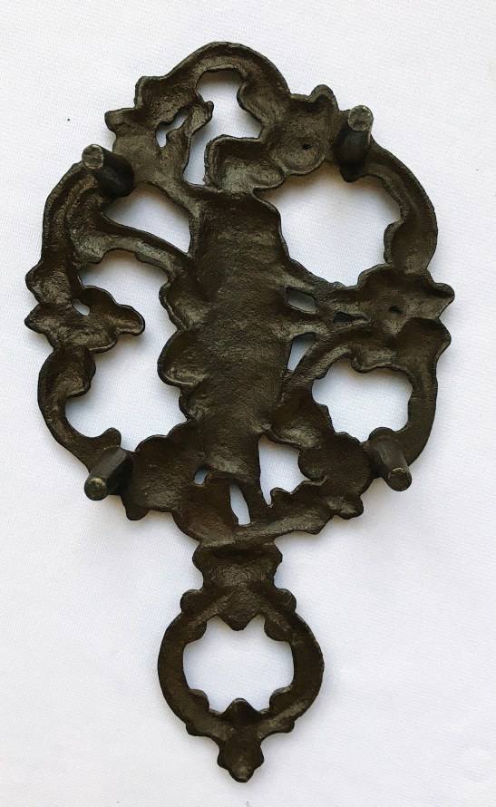 Details: 8 1/2″ x 4 7/8″ with four 7/8″ legs. No definite casting mark can be identified. Being one size smaller than my cast iron trivet, it’s likely a reproduction, created using a larger original as a pattern.