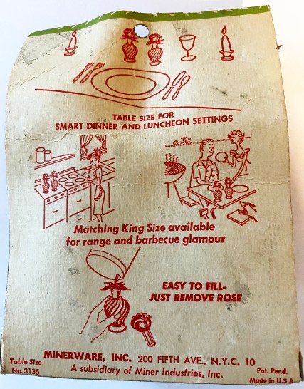 Reverse of Minerware Table Size S&P cardboard packaging. It mentions a larger King Size S&P “for range and barbecue glamour.”