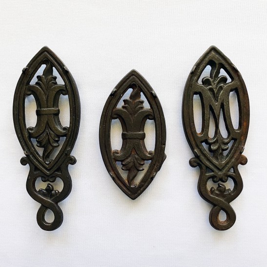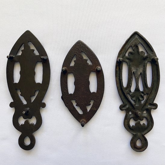 Each of these three little sad iron stands (trivets) supported a small double pointed sad iron; their oval shape and four angled iron guides are the tipoff.
