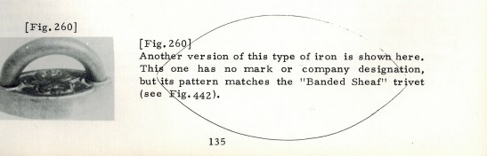 ● Banded Sheaf: 3 3/4″ long x 2″ wide x 1/2″ tall. One pronounced, unfiled gate mark along the side. TC, p. 236, Fig. 442 [c]. Also documented on p. 250 of Trivets & Stands (1990).