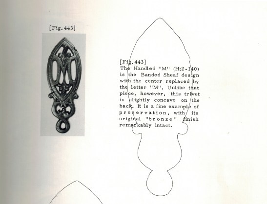 ● Handled M: 5 3/8″ long x 2″ wide x 1/2″ tall. One gate mark along the side. Backcoping on the reverse. In this similar design the sheaf of wheat was replaced with the letter M. TC, p. 237, Fig. 443. Also documented on p. 249 of Trivets & Stands (1990).