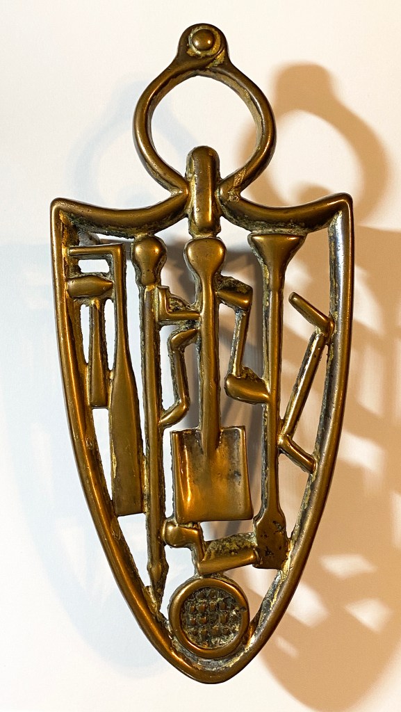 It’s often hard to find casting marks on brass because it’s a soft metal. But on further examination I believe I have located the sprue mark through which this trivet was cast. In the center of this reverse image, on the bulb-shaped handle of the shovel, is a 1/4″ round depressed circle.