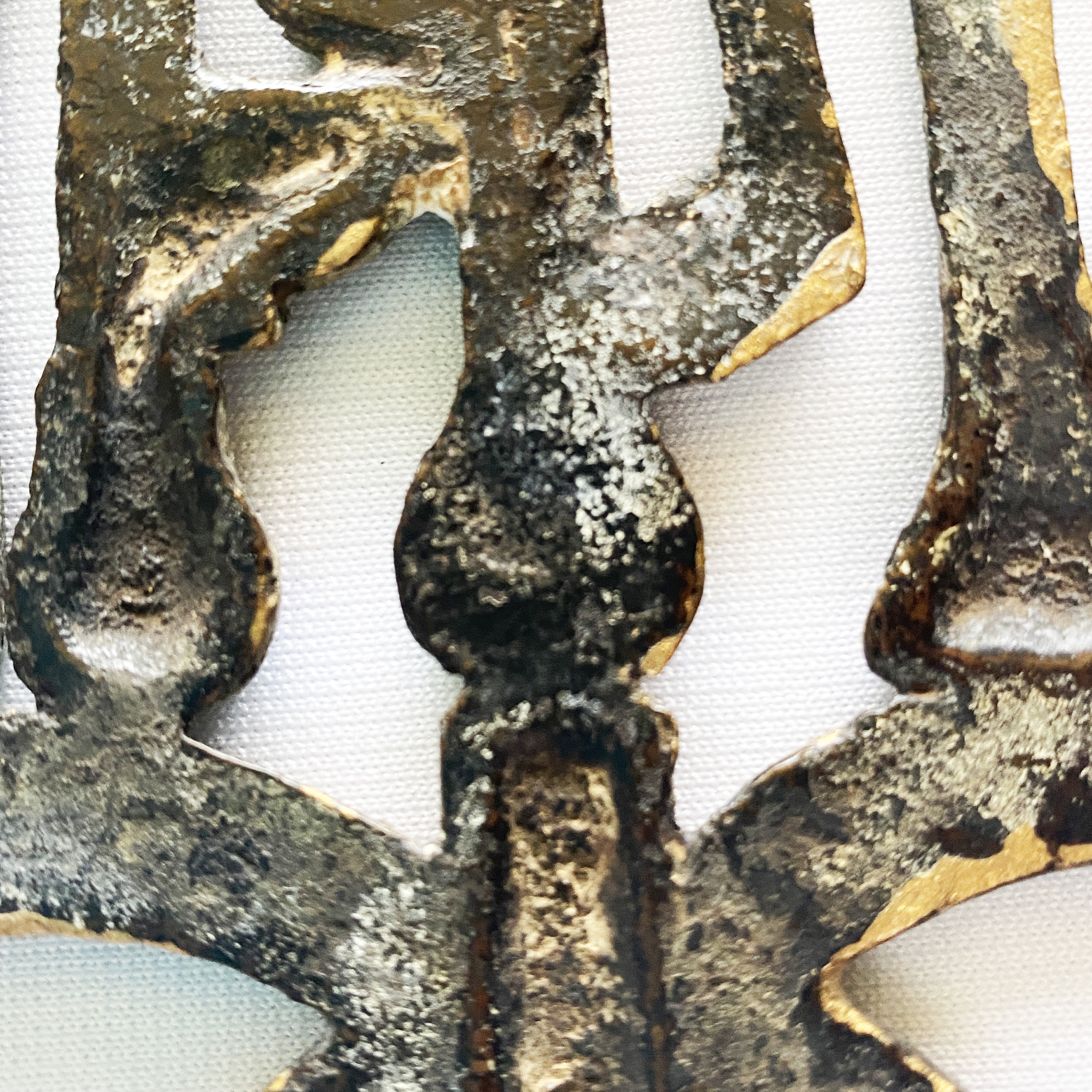 Description: Brass, 8 3/4″ x 4″ with three long 1 3/4″ legs. Some backcoping to the reverse. Weight = 1 pound. Although there’s an inward bend to all three legs, the trivet still sits squarely on a flat surface and displays well. There is evidence of dried polish in the crevasses and at some point in the past a thin coat of gold paint was applied to the top surface. Note that the back has been left unpolished, forming a dark patina. Although it may appear rough, the reverse is smooth to the touch. I cannot positively identify the point of casting on this trivet.