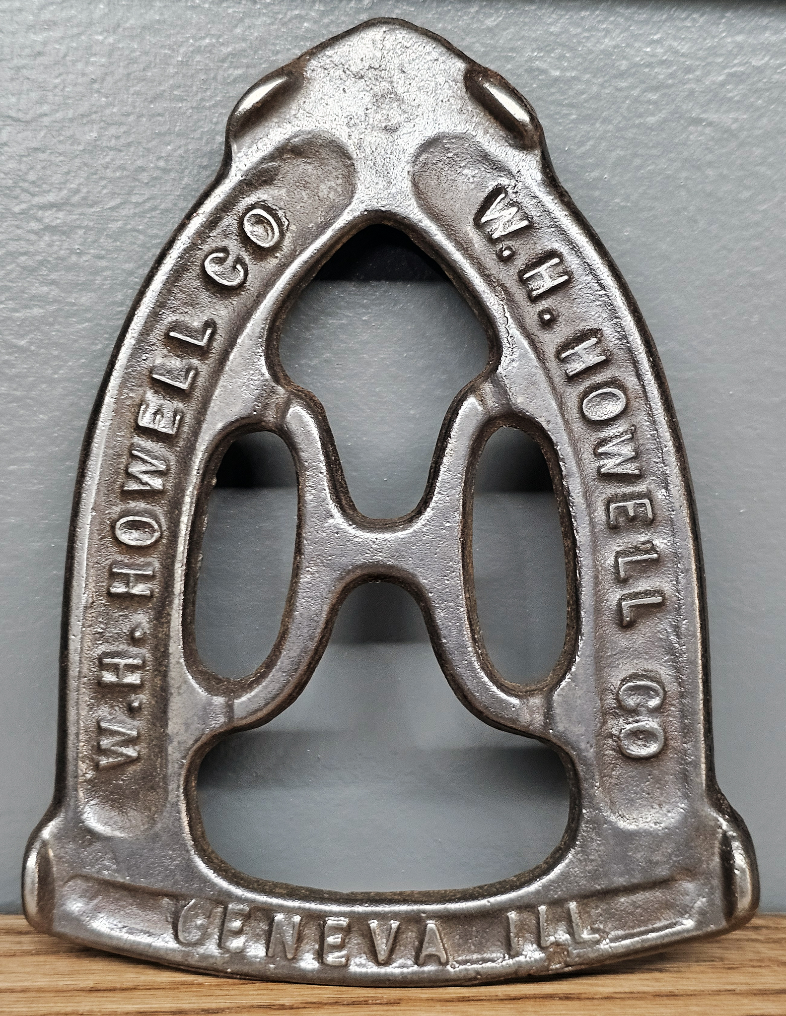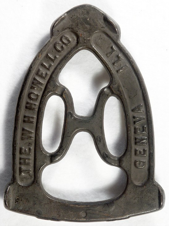 Cast iron, 5 7/8″ x 4 1/4″ with three 5/8″ feet. On face: H in the center and W. H. HOWELL CO (left side) and GENEVA. ILL. (right side) in the side panels.
