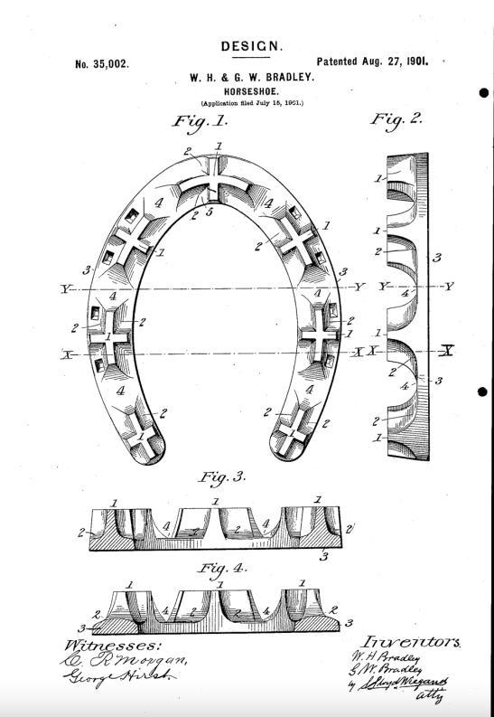 #2: I’ve found mention online of a Bradley Patent Horse Shoe Company. Was it owned by the same Bradleys who submitted these patents? Was their horseshoe with cruciform caulks successfully marketed? I have not yet found any examples of, or advertising for, this patented horseshoe.