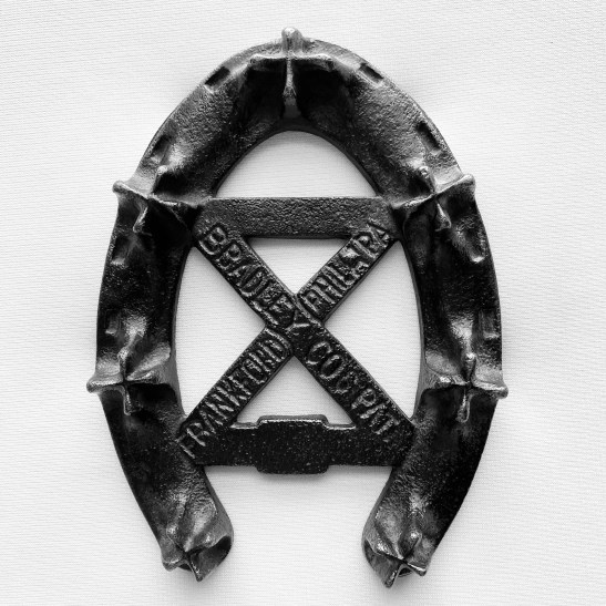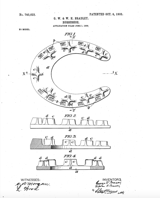 ★ 1903: Utility Patent # 740,623: George W. and William H. Bradley were assigned this utility patent on October 6, 1903 for their improved horseshoe with NINE “cruciform caulks” on the reverse. The patent description explains how this improved design would better support the horse’s hoof, provide better traction, and resist getting clogged with earth.