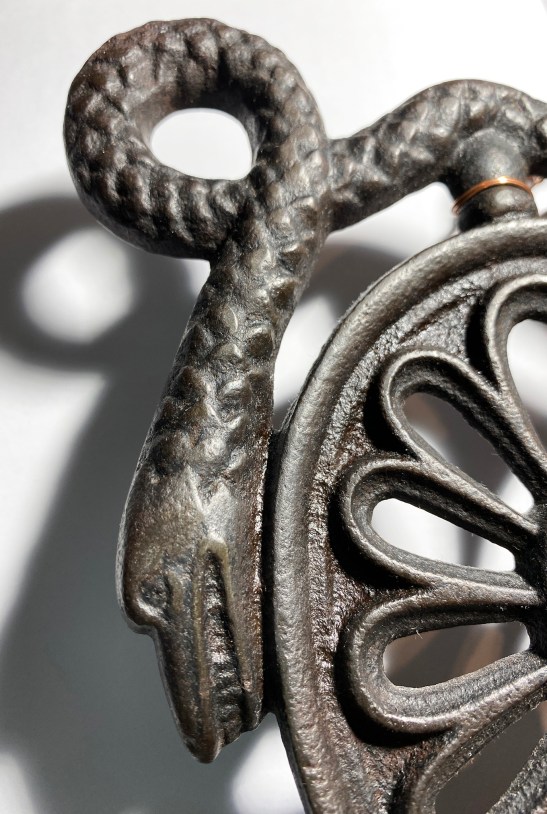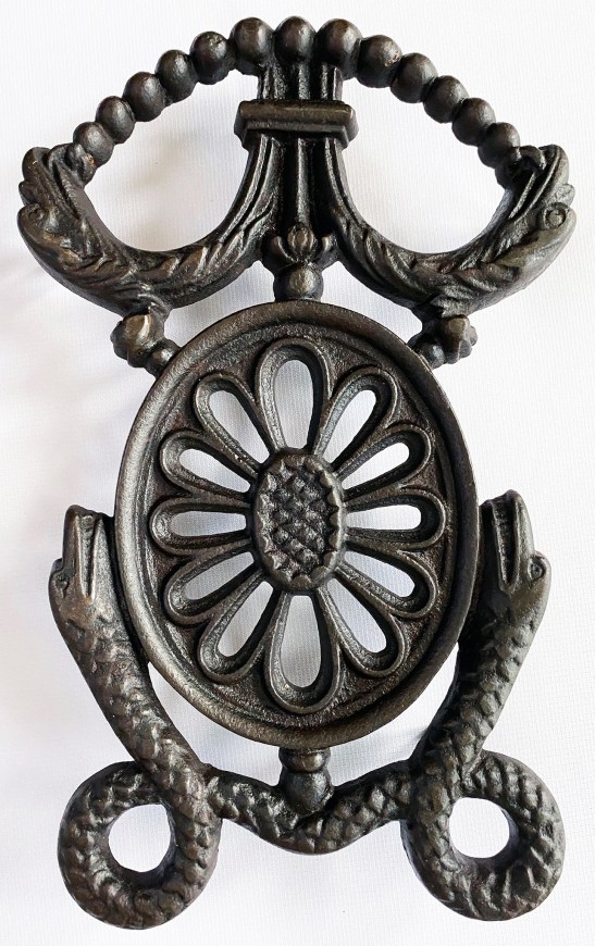This handsome sad iron stand is a favorite of mine. Although the designer, artist and foundry are unknown, it’s most likely an American casting. The prominent sprue mark on the reverse and long legs suggest it dates from the early to mid 1800s.