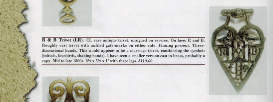 And finally, this R & B trivet just sold at auction! It was one of thirteen trivets in Lot 120 from a large trivet collection, presented by the Atlanta Auction Gallery on April 15, 2023. I know who won it and will request she update us once the shipment is received and the trivet examined. I’ll be interested to learn the measurements and discover what type of cast mark(s) it has.