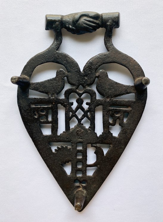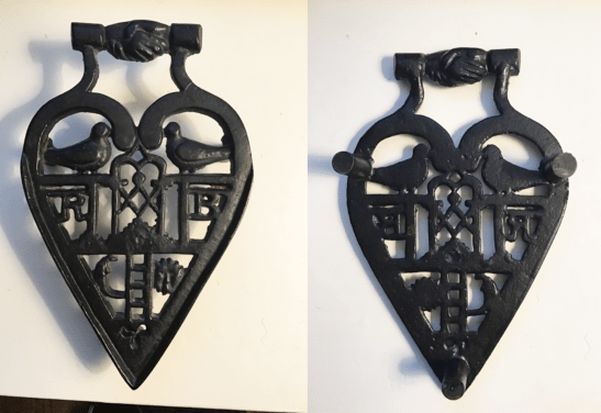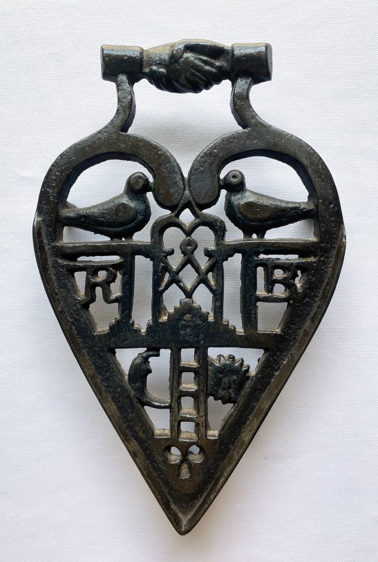 Very intrigued, as I have a trivet identical to this, given as a wedding gift to my grandparents in 1916 (they lived in England). My mother told me that between the moon & stars was Jacob’s ladder leading, above it, to the gates of Heaven. Would love to know more about what you’ve learned about its Pennsylvania Dutch origin, especially as it fetched up in England, and whether you know the meaning of the letters “R” and”B”.