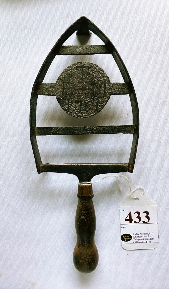 This may be the oldest pressing iron stand or trivet in my collection. Dated 1761, it precedes the Revolutionary War. I purchased it from Valley Auction (Dublin, VA) in their 1/04/20 Americana Auction on LiveAuctioneers.