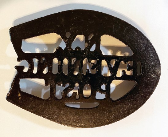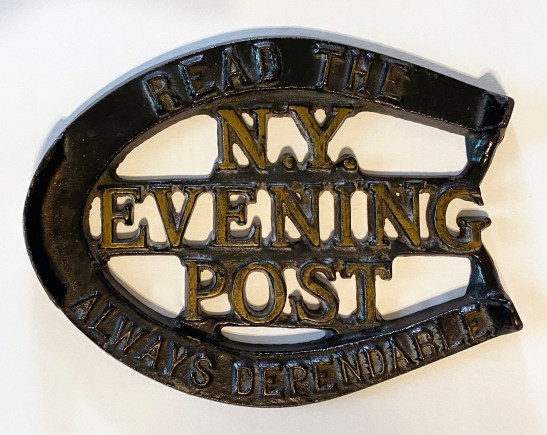 Recently I purchased an interesting horseshoe-shaped casting on eBay. Although listed as “Rare Cast Iron Trivet for SATURDAY EVENING POST ” (a magazine), it actually advertised the N. Y. EVENING POST (a newspaper). An Internet search revealed only one other example, on Worthpoint.