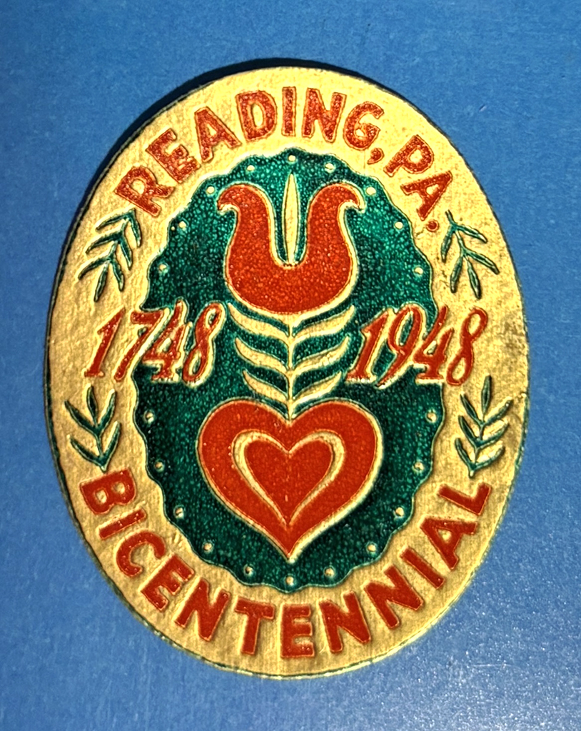 The emblem on this gold foil sticker was the official logo for Reading Pennsylvania’s Bicentennial Celebration, held August 14 through September 6, 1948 at the Reading Fair Grounds.