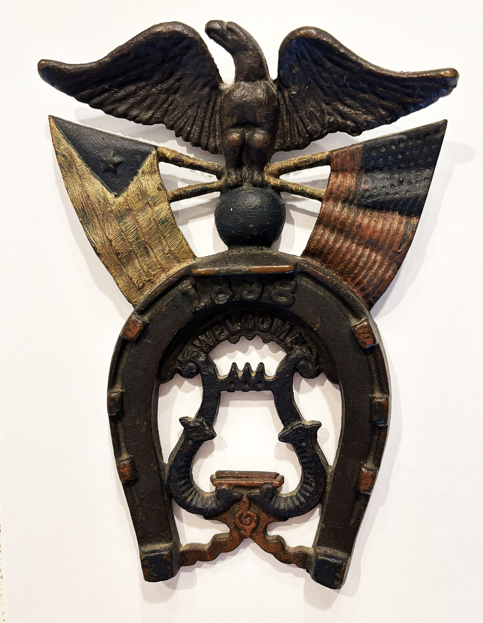 On March 12th I won this interesting horseshoe plaque trivet at auction on LiveAuctioneers. It was listed as a “Cast Iron Good Luck – Welcome Horseshoe with polychrome flags dated 1898, VG+ cond. 8″H.”