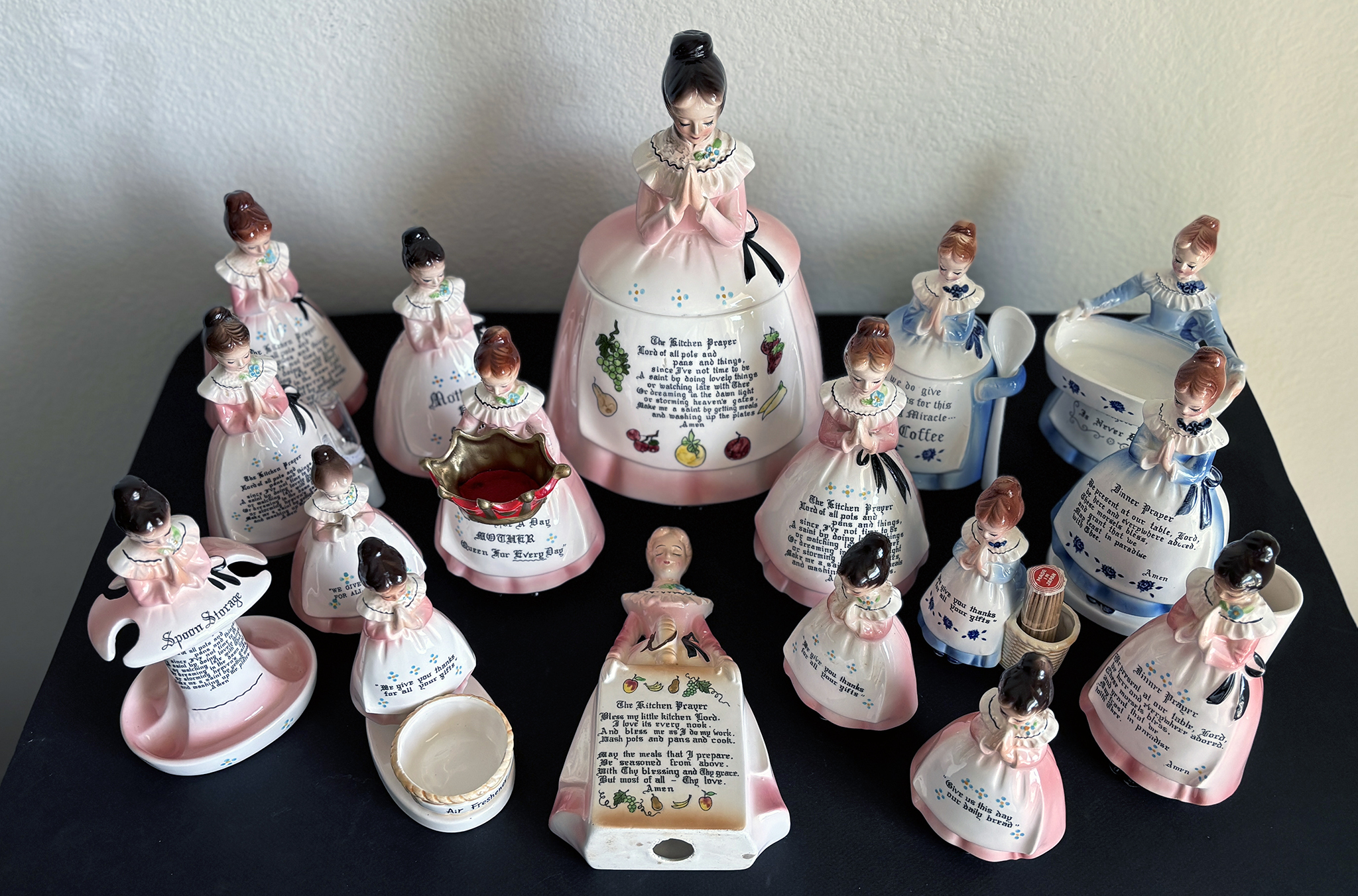 The Mother In The Kitchen line of ceramic giftware was produced by Enesco and sold in the United States from 1956 through the 1960s. Pieces are also referred to as Prayer Ladies since many figures featured praying hands and/or a short prayer or inspirational phrase.
