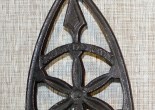 Above: nickel-plated cast iron, 4 5/8” w/four 3/8” pad feet. On face: L. These two intricate trivets were cast through the rim. Considering the molten iron had to flow uninterrupted … Continue reading